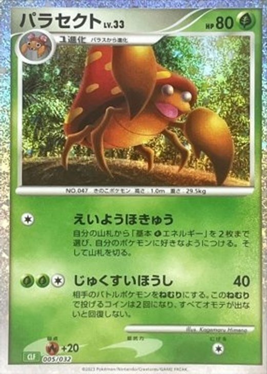 自分の山札から「基本草エネルギー」を2枚まで選び、自分のポケモンに好きなようにつける。そして山札を切る。
