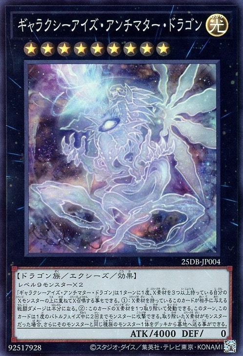「ギャラクシーアイズ・アンチマター・ドラゴン」は1ターンに1度、X素材を3つ以上持っている自分のXモンスターの上に重ねてX召喚する事もできる。_x000D_