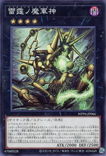 このカード名の①②の効果はそれぞれ1ターンに1度しか使用できない。①:このカードのX素材を1つ取り除き、「雷霆ノ魔軍神」以外の自分の墓地のレベル4かランク4のサイキック族モンスター1体を対象として発動できる。そのモンスターを特殊召喚する。②:このカードがモンスターゾーンに存在する状態で、モンスターが特殊召喚された場合、このカード以外のフィールドの表側表示モンスター1体を対象として発動できる。そのモンスターのカード名をエンドフェイズまで「雷霆ノ魔軍神」として扱う。