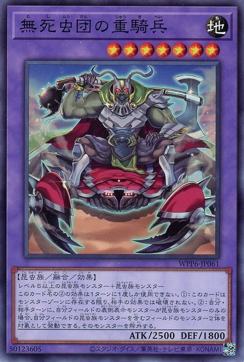 このカード名の②の効果は1ターンに1度しか使用できない。①:このカードはモンスターゾーンに存在する限り、相手の効果では破壊されない。②:自分・相手ターンに、自分フィールドの表側表示モンスターが昆虫族モンスターのみの場合、自分フィールドの昆虫族モンスターを含むフィールドのモンスター2体を対象として発動できる。そのモンスターを除外する。