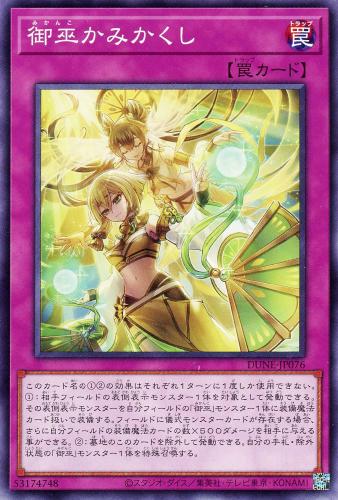 ①:相手フィールドの表側表示モンスター1体を対象として発動できる。その表側表示モンスターを自分フィールドの「御巫」モンスター1体に装備魔法カード扱いで装備する。フィールドに儀式モンスターカードが存在する場合、さらに自分フィールドの装備魔法カードの数×500ダメージを相手に与える事ができる。