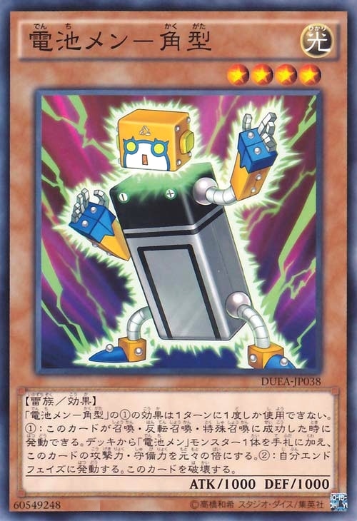 「電池メン-角型」の①の効果は1ターンに1度しか使用できない。[1]:このカードが召喚・反転召喚・特殊召喚に成功した時に発動できる。デッキから「電池メン」モンスター1体を手札に加え、このカードの攻撃力・守備力を元々の倍にする。[2]:自分エンドフェイズに発動する。このカードを破壊する。