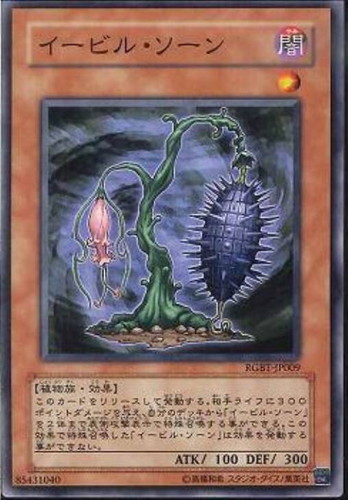 - このカードをリリースして発動する。相手ライフに300ポイントダメージを与え、自分のデッキから「イービル・ソーン」を2体まで表側攻撃表示で特殊召喚する事ができる。この効果で特殊召喚した「イービル・ソーン」は効果を発動する事ができない。