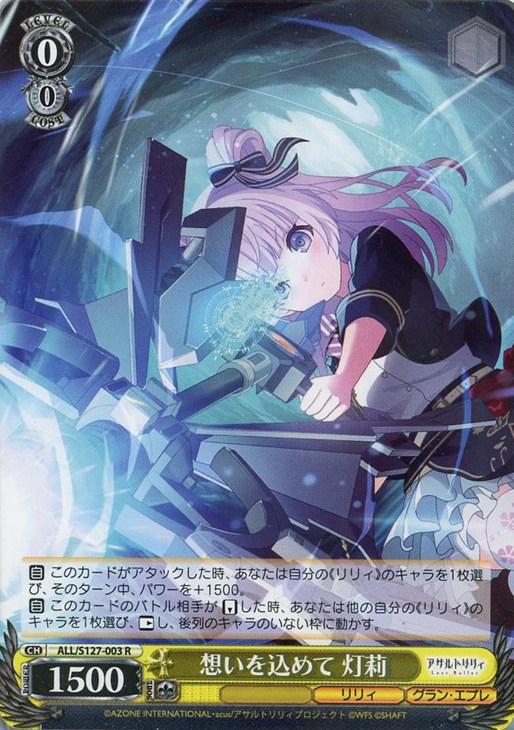 【自】 このカードのバトル相手が【リバース】した時、あなたは他の自分の《リリィ》のキャラを1枚選び、【レスト】し、後列のキャラのいない枠に動かす。