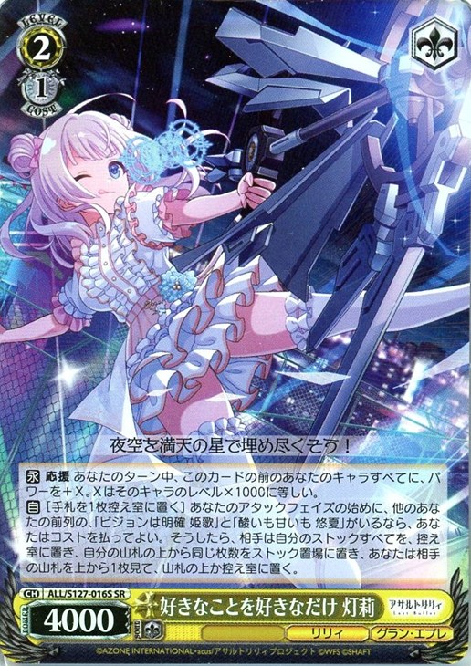 【自】[手札を1枚控え室に置く] あなたのアタックフェイズの始めに、他のあなたの前列の、「ビジョンは明確 姫歌」と「酸いも甘いも 悠夏」がいるなら、あなたはコストを払ってよい。そうしたら、相手は自分のストックすべてを、控え室に置き、自分の山札の上から同じ枚数をストック置場に置き、あなたは相手の山札を上から1枚見て、山札の上か控え室に置く。