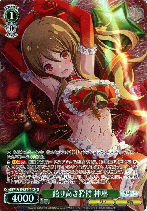 【自】【CXコンボ】[(1)] このカードのアタックの終わりに、CX置場に「吐息を重ねて」があり、他のあなたの《リリィ》のキャラがいるなら、あなたはコストを払ってよい。そうしたら、あなたは自分の山札を上から5枚まで見て、《リリィ》のキャラを2枚まで選んで相手に見せ、1枚選び、手札に加え、1枚選び、ストック置場の上か下に置き、残りのカードを控え室に置く。