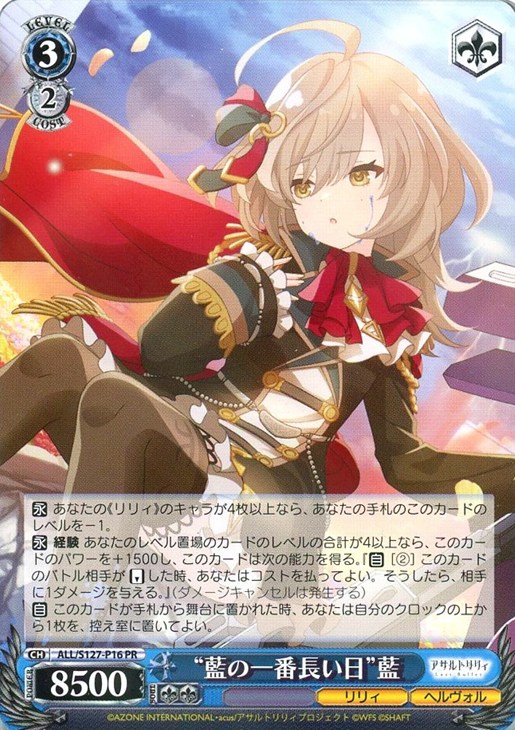 【永】 経験 あなたのレベル置場のカードのレベルの合計が4以上なら、このカードのパワーを+1500し、このカードは次の能力を得る。『【自】[(2)] このカードのバトル相手が【リバース】した時、あなたはコストを払ってよい。そうしたら、相手に1ダメージを与える。』(ダメージキャンセルは発生する)