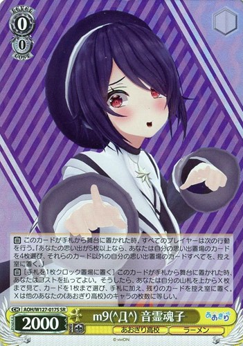 【自】[手札を1枚クロック置場に置く] このカードが手札から舞台に置かれた時、あなたはコストを払ってよい。そうしたら、あなたは自分の山札を上からX枚まで見て、カードを1枚まで選び、手札に加え、残りのカードを控え室に置く。Xは他のあなたの《あおぎり高校》のキャラの枚数に等しい。