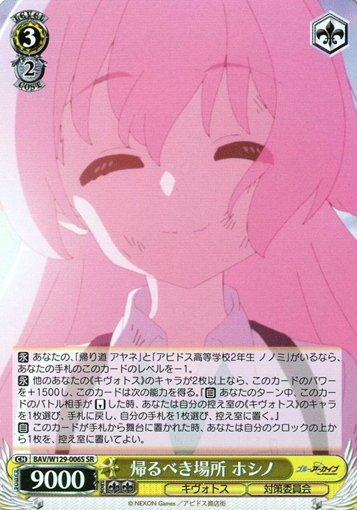 【永】 他のあなたの《キヴォトス》のキャラが2枚以上なら、このカードのパワーを+1500し、このカードは次の能力を得る。『【自】 あなたのターン中、このカードのバトル相手が【リバース】した時、あなたは自分の控え室の《キヴォトス》のキャラを1枚選び、手札に戻し、自分の手札を1枚選び、控え室に置く。』