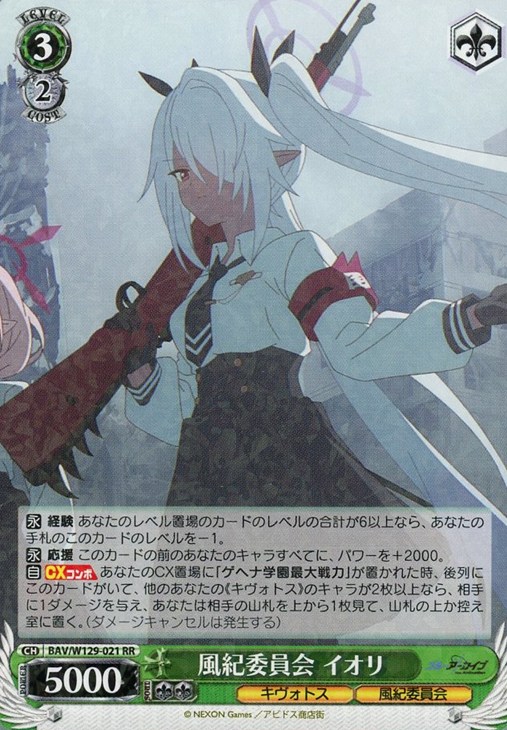 【自】【CXコンボ】 あなたのCX置場に「ゲヘナ学園最大戦力」が置かれた時、後列にこのカードがいて、他のあなたの《キヴォトス》のキャラが2枚以上なら、相手に1ダメージを与え、あなたは相手の山札を上から1枚見て、山札の上か控え室に置く。(ダメージキャンセルは発生する)