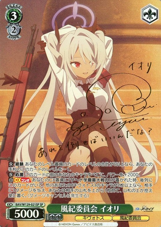 【自】【CXコンボ】 あなたのCX置場に「ゲヘナ学園最大戦力」が置かれた時、後列にこのカードがいて、他のあなたの《キヴォトス》のキャラが2枚以上なら、相手に1ダメージを与え、あなたは相手の山札を上から1枚見て、山札の上か控え室に置く。(ダメージキャンセルは発生する)