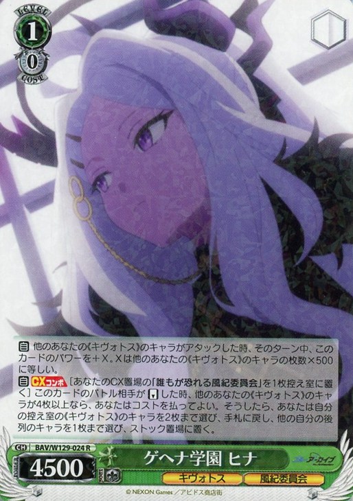 【自】【CXコンボ】[あなたのCX置場の「誰もが恐れる風紀委員会」を1枚控え室に置く] このカードのバトル相手が【リバース】した時、他のあなたの《キヴォトス》のキャラが4枚以上なら、あなたはコストを払ってよい。そうしたら、あなたは自分の控え室の《キヴォトス》のキャラを2枚まで選び、手札に戻し、他の自分の後列のキャラを1枚まで選び、ストック置場に置く。