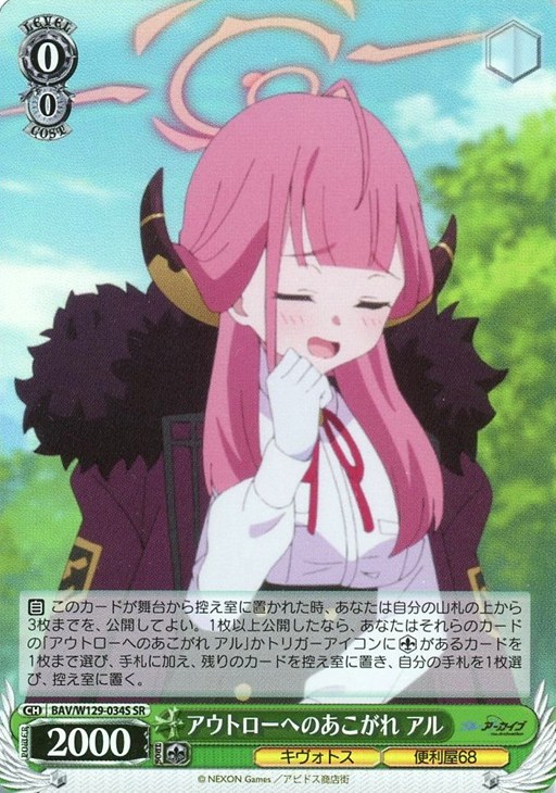 【自】 このカードが舞台から控え室に置かれた時、あなたは自分の山札の上から3枚までを、公開してよい。1枚以上公開したなら、あなたはそれらのカードの「アウトローへのあこがれ アル」かトリガーアイコンにソウル+1があるカードを1枚まで選び、手札に加え、残りのカードを控え室に置き、自分の手札を1枚選び、控え室に置く。