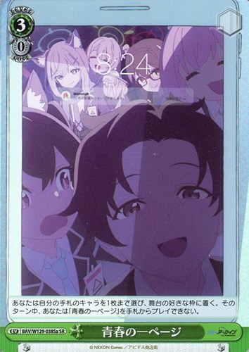 - あなたは自分の手札のキャラを1枚まで選び、舞台の好きな枠に置く。そのターン中、あなたは「青春の一ページ」を手札からプレイできない。