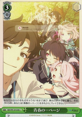 - あなたは自分の手札のキャラを1枚まで選び、舞台の好きな枠に置く。そのターン中、あなたは「青春の一ページ」を手札からプレイできない。