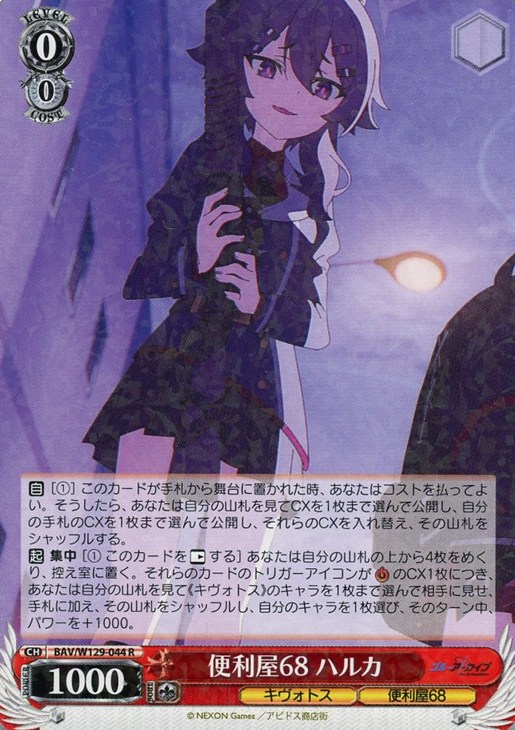 【起】 集中 [(1) このカードを【レスト】する] あなたは自分の山札の上から4枚をめくり、控え室に置く。それらのカードのトリガーアイコンがスタンバイのCX1枚につき、あなたは自分の山札を見て《キヴォトス》のキャラを1枚まで選んで相手に見せ、手札に加え、その山札をシャッフルし、自分のキャラを1枚選び、そのターン中、パワーを+1000。