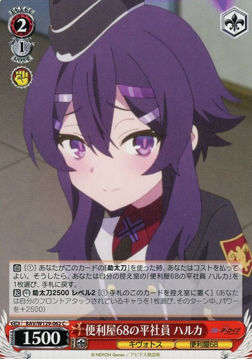 【起】【カウンター】 助太刀2500 レベル2 [(1) 手札のこのカードを控え室に置く] (あなたは自分のフロントアタックされているキャラを1枚選び、そのターン中、パワーを+2500)