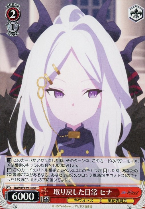【自】 このカードのバトル相手でレベル2以上のキャラが【リバース】した時、あなたのCX置場にCXがあるなら、あなたは自分のクロック置場の《キヴォトス》のキャラを1枚選び、山札の下に置いてよい。