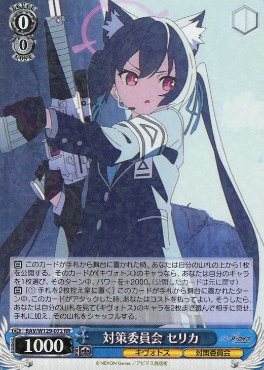 【自】[(1) 手札を2枚控え室に置く] このカードが手札から舞台に置かれたターン中、このカードがアタックした時、あなたはコストを払ってよい。そうしたら、あなたは自分の山札を見て《キヴォトス》のキャラを2枚まで選んで相手に見せ、手札に加え、その山札をシャッフルする。