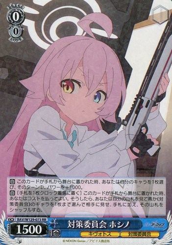 【自】[手札を1枚クロック置場に置く] このカードが手札から舞台に置かれた時、あなたはコストを払ってよい。そうしたら、あなたは自分の山札を見て青か《対策委員会》のキャラを1枚まで選んで相手に見せ、手札に加え、その山札をシャッフルする。
