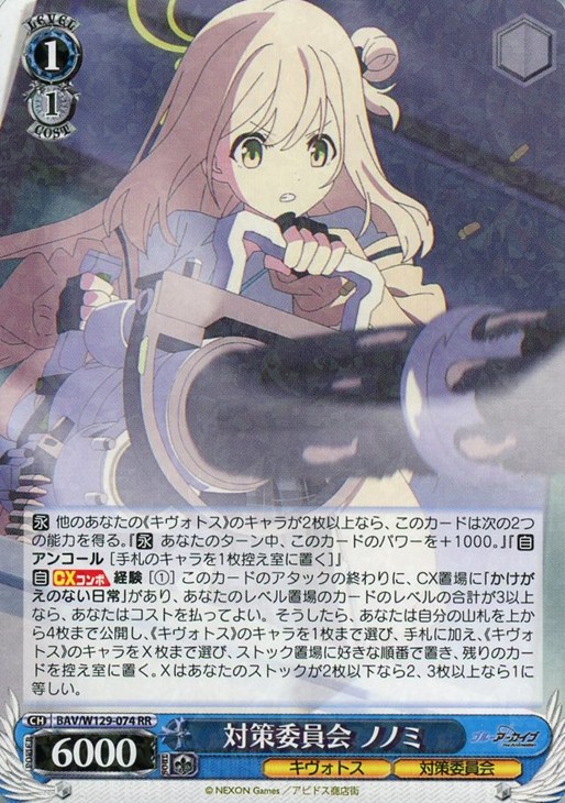 【自】【CXコンボ】 経験 [(1)] このカードのアタックの終わりに、CX置場に「かけがえのない日常」があり、あなたのレベル置場のカードのレベルの合計が3以上なら、あなたはコストを払ってよい。そうしたら、あなたは自分の山札を上から4枚まで公開し、《キヴォトス》のキャラを1枚まで選び、手札に加え、《キヴォトス》のキャラをX枚まで選び、ストック置場に好きな順番で置き、残りのカードを控え室に置く。Xはあなたのストックが2枚以下なら2、3枚以上なら1に等しい。