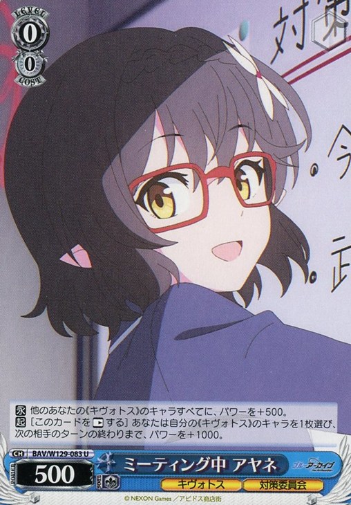 【起】[このカードを【レスト】する] あなたは自分の《キヴォトス》のキャラを1枚選び、次の相手のターンの終わりまで、パワーを+1000。
