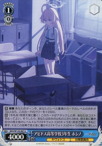 【自】[手札を1枚控え室に置く] このカードがアタックした時、あなたはコストを払ってよい。そうしたら、あなたは自分の山札の上から3枚を、控え室に置き、自分の控え室のレベルX以下の《キヴォトス》のキャラを1枚まで選び、手札に戻す。Xはこの効果で控え室に置かれた《キヴォトス》のキャラの枚数に等しい。