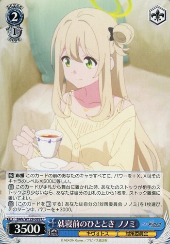 【起】[このカードを【レスト】する] あなたは自分の「対策委員会 ノノミ」を1枚選び、そのターン中、パワーを+3000。