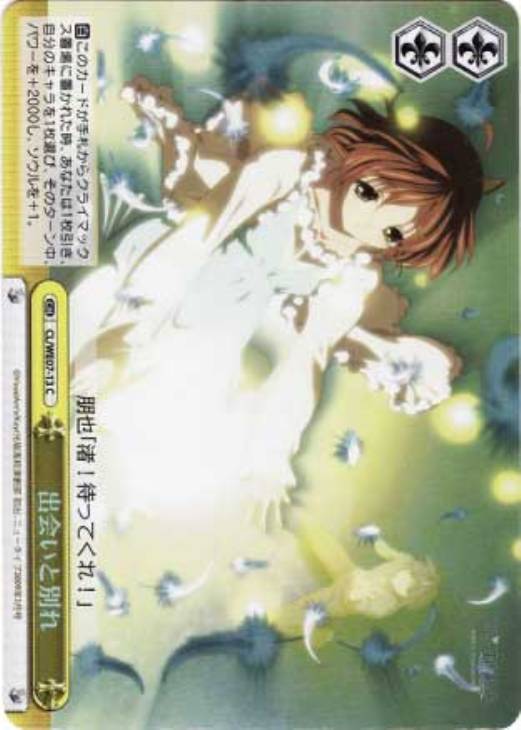 - 【自】 このカードが手札からクライマックス置場に置かれた時、あなたは1枚引き、自分のキャラを1枚選び、そのターン中、パワーを+2000し、ソウルを+1。フレーバー:渚「少し疲れてしまいました。 ちょっとだけ、休ませてください…」