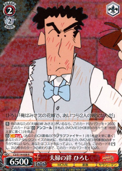 - 【永】 他のあなたの「夫婦の絆 みさえ」がいるなら、このカードのパワーを+3500し、このカードは『【自】 アンコール [手札の、《MOVIE》か《家族》のキャラを1枚控え室に置く]』を得る。 【自】【CXコンボ】[あなたのCX置場の「ラブラブファイヤー!」を1枚控え室に置く] あなたのアタックフェイズの始めに、他のあなたの、《MOVIE》か《家族》のキャラが2枚以上なら、あなたはコストを払ってよい。そうしたら、このカードを【スタンド】し、次の相手のターンの終わりまで、このカードのパワーを+1000。