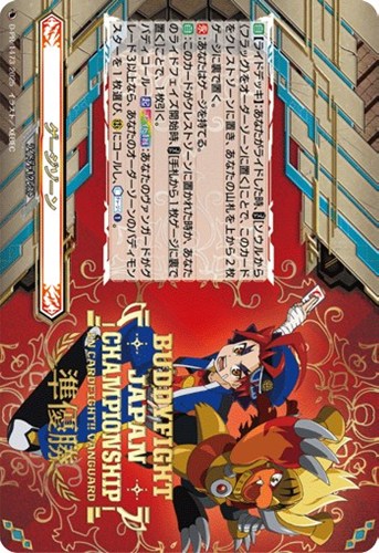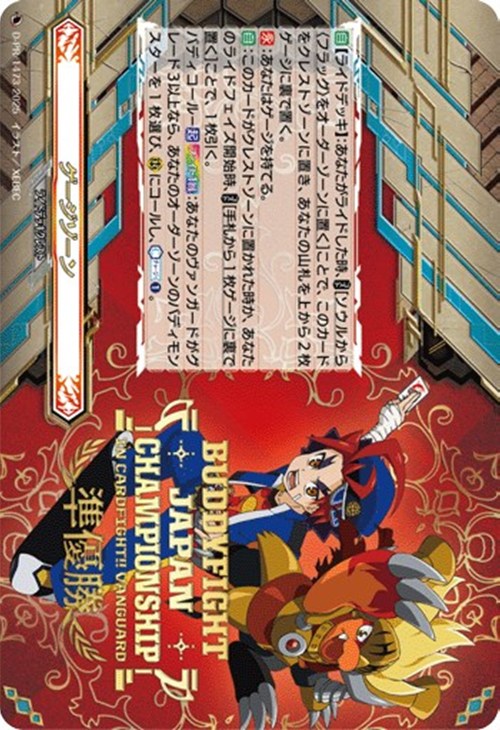 【自】:このカードがクレストゾーンに置かれた時か、あなたのライドフェイズ開始時、【コスト】[手札から1枚ゲージに裏で置く]ことで、1枚引く。バディコール-【起】【ファイト1回】:あなたのヴァンガードがグレード3以上なら、あなたのオーダーゾーンのバディモンスターを1枚選び、(R)にコールし、【カウンターチャージ】(1)。