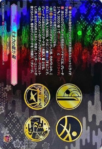 【永】:あなたのヴァンガードと同名のカードすべては、グレード3/パワー13000/クリティカル1で『ツインドライブ』と『ペルソナライド』と以下すべてを持つユニットになる。 ・【自】【(V)】:このユニットがアタックした時、そのバトル中、このユニットのパワー+10000。さらに【コスト】[【カウンターブラスト】(1)]することで、グレード3のあなたのリアガードを1枚選び、【スタンド】させる。 ・【自】【(V)】:このユニットのアタックがヴァンガードにヒットした時、あなたの山札を上から1枚捨て、トリガーユニットが捨てられたら、相手のヴァンガードを1枚選び、1ダメージ。