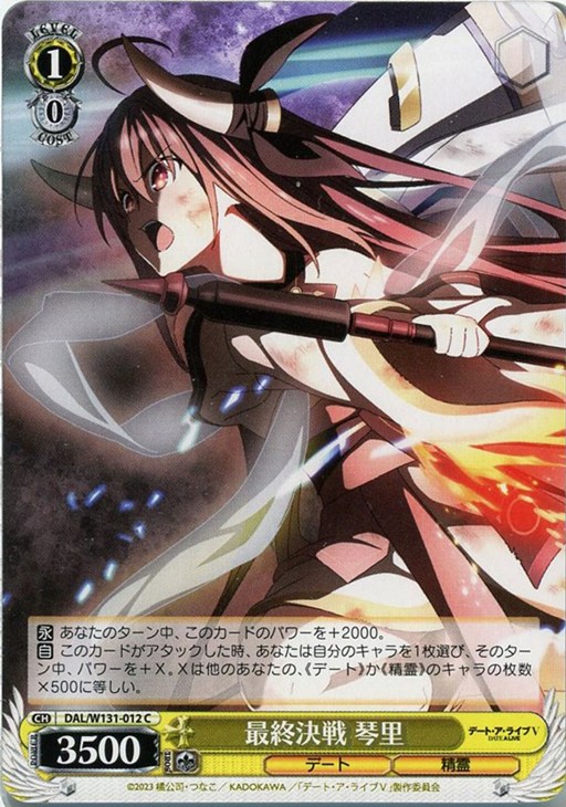 【自】 このカードがアタックした時、あなたは自分のキャラを1枚選び、そのターン中、パワーを+X。Xは他のあなたの、《デート》か《精霊》のキャラの枚数×500に等しい。