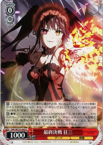 【起】 集中 [(1)] あなたは自分の山札の上から4枚をめくり、控え室に置く。それらのカードのCX1枚につき、次の行動を行う。『あなたは自分の山札を見て《デート》か《精霊》のキャラを1枚まで選んで相手に見せ、手札に加え、自分の手札を1枚選び、控え室に置き、その山札をシャッフルする。』
