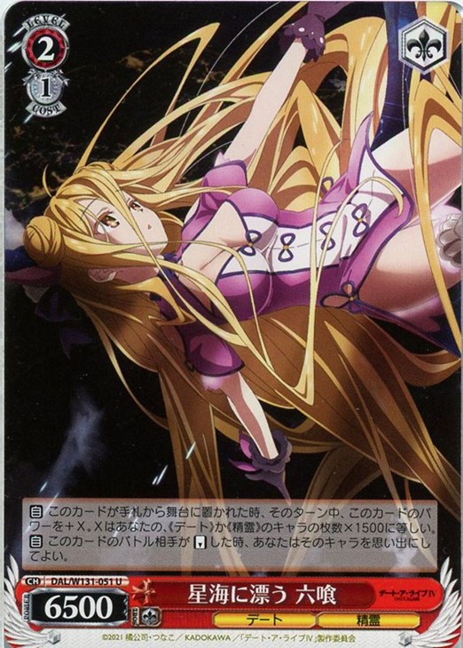 【自】 このカードが手札から舞台に置かれた時、そのターン中、このカードのパワーを+X。Xはあなたの、《デート》か《精霊》のキャラの枚数×1500に等しい。