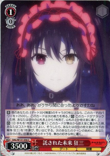 【自】[(2) 手札を1枚控え室に置く] このカードが舞台から控え室に置かれた時、あなたはコストを払ってよい。そうしたら、あなたは自分の控え室の「月下の献身 狂三」を1枚選び、思い出にする。次のあなたのターンの始めに、あなたは自分の思い出置場のそのキャラを、舞台の好きな枠に置く。