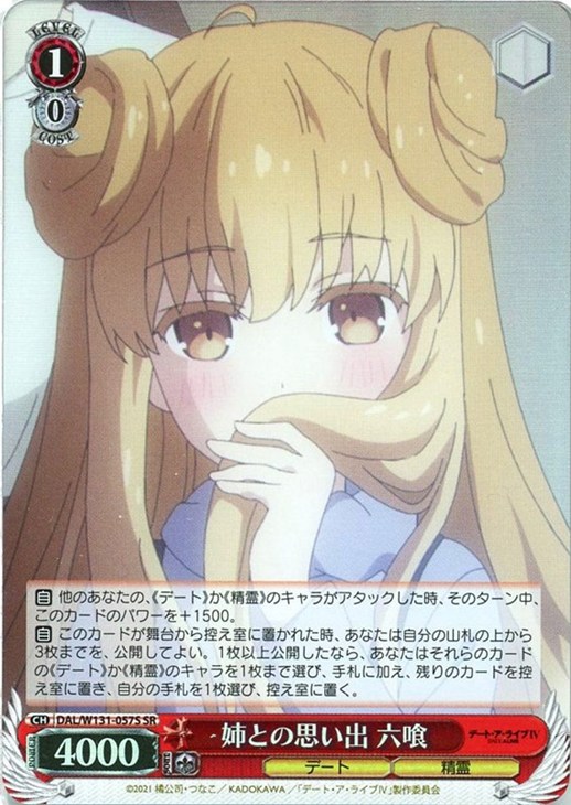 【自】 このカードが舞台から控え室に置かれた時、あなたは自分の山札の上から3枚までを、公開してよい。1枚以上公開したなら、あなたはそれらのカードの《デート》か《精霊》のキャラを1枚まで選び、手札に加え、残りのカードを控え室に置き、自分の手札を1枚選び、控え室に置く。