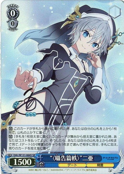 【自】[手札を1枚控え室に置く] このカードが舞台から控え室に置かれた時、あなたはコストを払ってよい。そうしたら、あなたは自分の山札を上から4枚まで見て、《デート》か《精霊》のキャラを1枚まで選んで相手に見せ、手札に加え、残りのカードを控え室に置く。