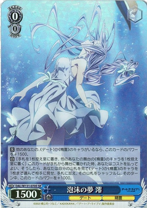 【自】[手札を1枚控え室に置き、他のあなたの舞台の《精霊》のキャラを1枚控え室に置く] このカードが手札から舞台に置かれた時、あなたはコストを払ってよい。そうしたら、あなたは自分の山札を見て《デート》か《精霊》のキャラを1枚まで選んで相手に見せ、手札に加え、その山札をシャッフルし、そのターン中、このカードのパワーを+1000。