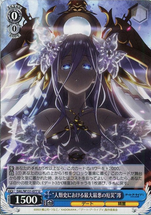 【自】[(1) あなたの山札の上から1枚をクロック置場に置く] このカードが舞台から控え室に置かれた時、あなたはコストを払ってよい。そうしたら、あなたは自分の控え室の、《デート》か《精霊》のキャラを1枚選び、手札に戻す。