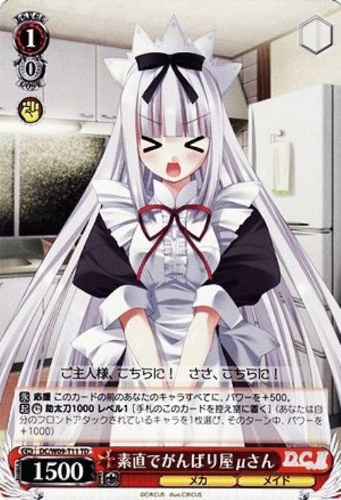 - 【永】 応援 このカードの前のあなたのキャラすべてに、パワーを+500。【起】【カウンター】 助太刀1000 レベル1 [手札のこのカードを控え室に置く] (あなたは自分のフロントアタックされているキャラを1枚選び、そのターン中、パワーを+1000)フレーバー:ご主人様、こちらに! ささ、こちらに!