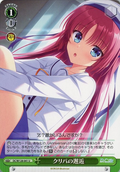 【カウンター】 このカードは、あなたの、《Anniversary》か《魔法》か《音楽》のキャラがいないなら、手札からプレイできない。あなたは自分のキャラを1枚選び、そのターン中、次の能力を与える。『【永】 このカードは【リバース】しない。』