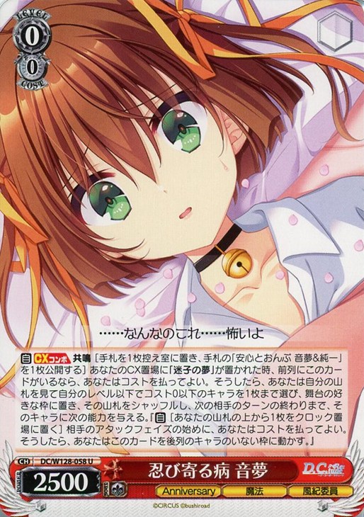 【自】【CXコンボ】 共鳴 [手札を1枚控え室に置き、手札の「安心とおんぶ 音夢&純一」を1枚公開する] あなたのCX置場に「迷子の夢」が置かれた時、前列にこのカードがいるなら、あなたはコストを払ってよい。そうしたら、あなたは自分の山札を見て自分のレベル以下でコスト0以下のキャラを1枚まで選び、舞台の好きな枠に置き、その山札をシャッフルし、次の相手のターンの終わりまで、そのキャラに次の能力を与える。『【自】[あなたの山札の上から1枚をクロック置場に置く] 相手のアタックフェイズの始めに、あなたはコストを払ってよい。そうしたら、あなたはこのカードを後列のキャラのいない枠に動かす。』