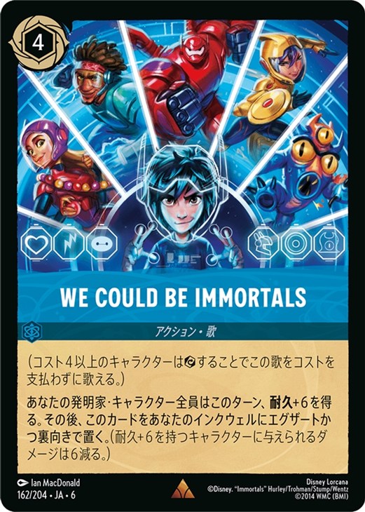 - (コスト4以上のキャラクターは[エグザート]することでこの歌をコストを支払わずに歌える。) あなたの発明家・キャラクター全員はこのターン、耐久+6を得る。その後、このカードをあなたのインクウェルにエグザートかつ裏向きで置く。(耐久+6を持つキャラクターに与えられるダメージは6減る。)