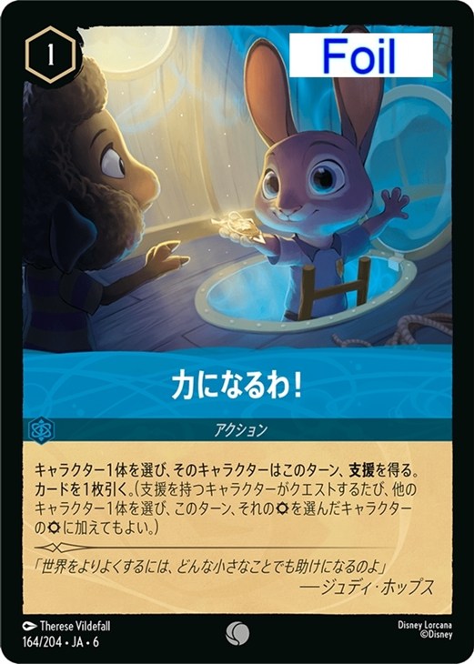 キャラクター1体を選び、そのキャラクターはこのターン、支援を得る。カードを1枚引く。(支援を持つキャラクターがクエストするたび、他のキャラクター1体を選び、このターン、それの[攻撃力]を選んだキャラクターの[攻撃力]に加えてもよい。)