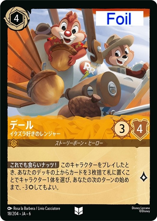 【これでも食らいナッツ!】 このキャラクターをプレイしたとき、あなたのデッキの上からカードを3枚捨て札に置くことでキャラクター1体を選び、あなたの次のターンの始めまで、-3[攻撃力]してもよい。