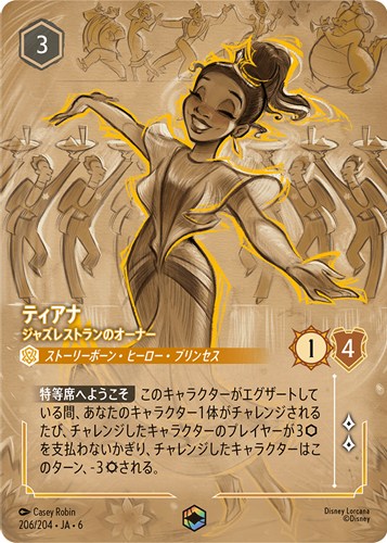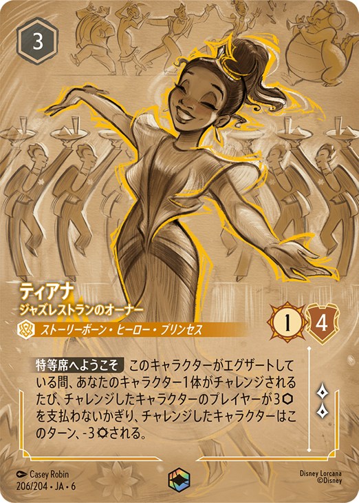 - 【特等席へようこそ】 このキャラクターがエグザートしている間、あなたのキャラクター1体がチャレンジされるたび、チャレンジしたキャラクターのプレイヤーが3[コスト]を支払わないかぎり、チャレンジしたキャラクターはこのターン、-3[攻撃力]される。