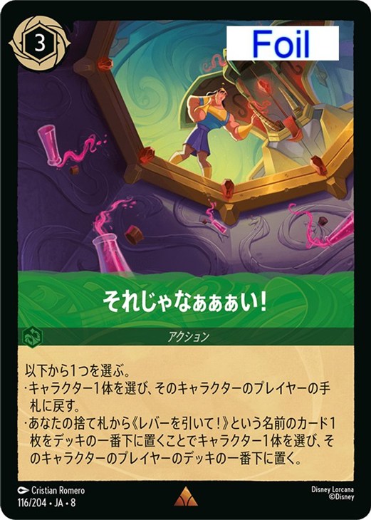 ・あなたの捨て札から《レバーを引いて!》という名前のカード1枚をデッキの一番下に置くことでキャラクター1体を選び、そのキャラクターのプレイヤーのデッキの一番下に置く。