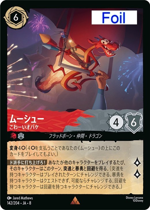 【ド派手に打ち上げろ!】 あなたが他のキャラクターをプレイするたび、そのキャラクターはこのターン、突進と暴勇と回避を得る。(突進を持つキャラクターはプレイされたターンにチャレンジできる。暴勇を持つキャラクターはクエストできず、可能ならチャレンジする。回避を持つキャラクターは回避を持つキャラクターにチャレンジできる。)