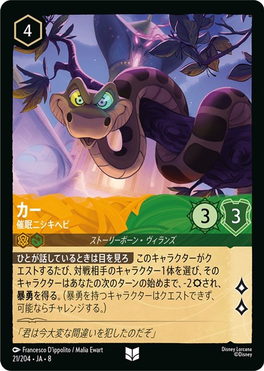 - 【ひとが話しているときは目を見ろ】 このキャラクターがクエストするたび、対戦相手のキャラクター1体を選び、そのキャラクターはあなたの次のターンの始めまで、-2[攻撃力]され、暴勇を得る。(暴勇を持つキャラクターはクエストできず、可能ならチャレンジする。)